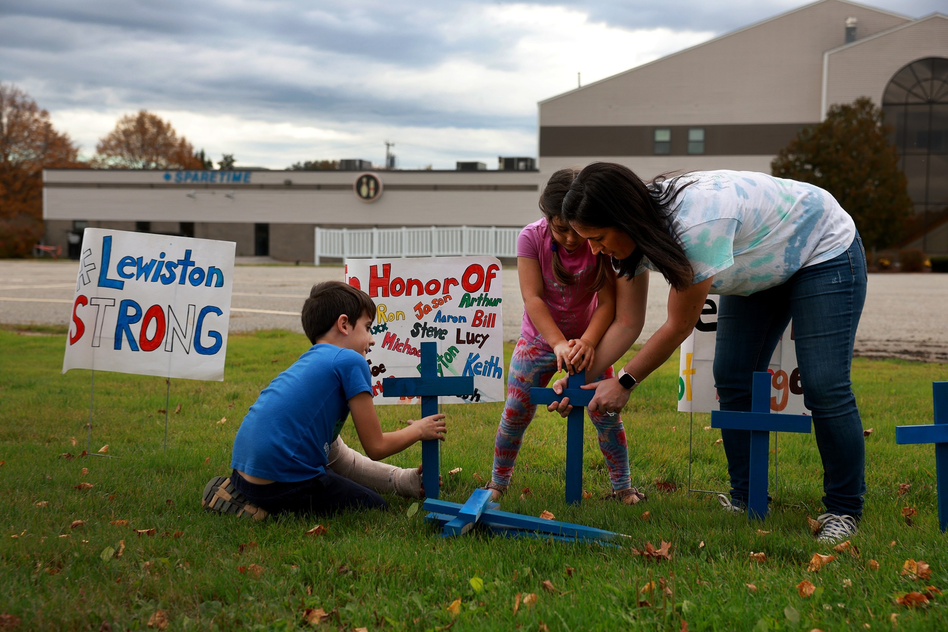 Bre Allard, in addition to her kids Zeke Allard, 8, and Lucy Allard, 5, location crosses and check in front of the Sparetime Leisure, just recently relabelled Just-In-Time Leisure, Oct. 28, 2023 in Lewiston, Maine.
