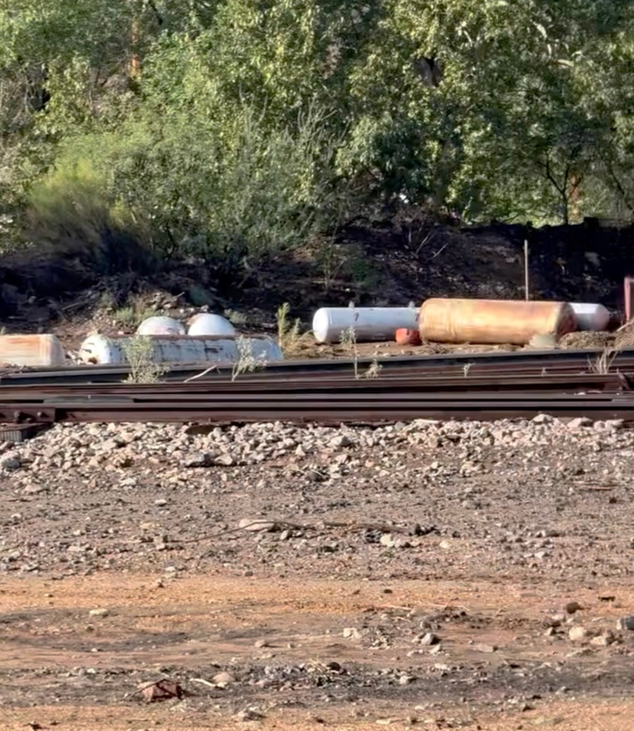Lp containers and particles aree revealed along United States 60 behind World Town Hall in World, Arizona, on Sept. 27, 2025.