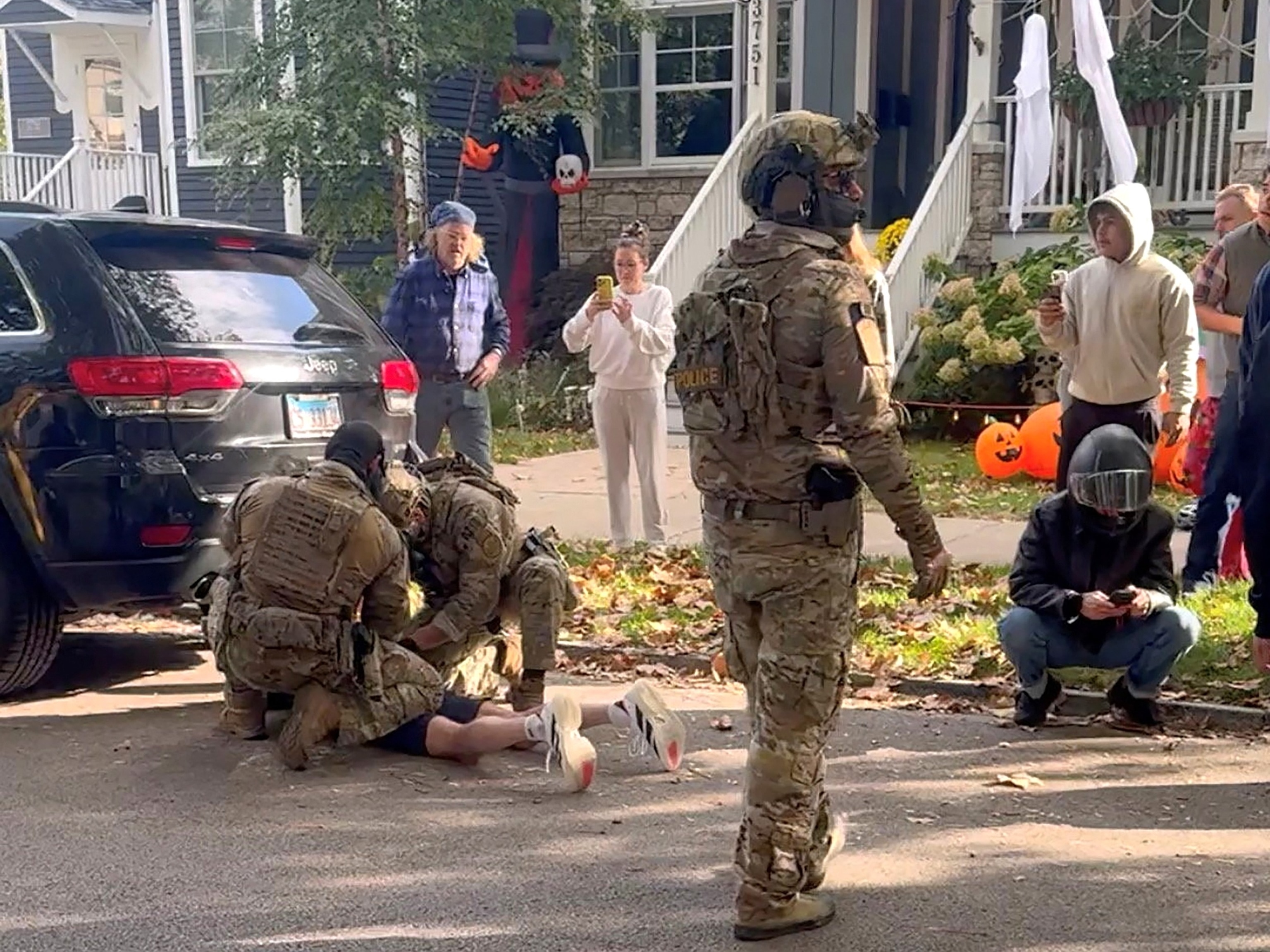 united state government representatives restrain an individual in the Old Irving Park area of Chicago, October 25, 2025
