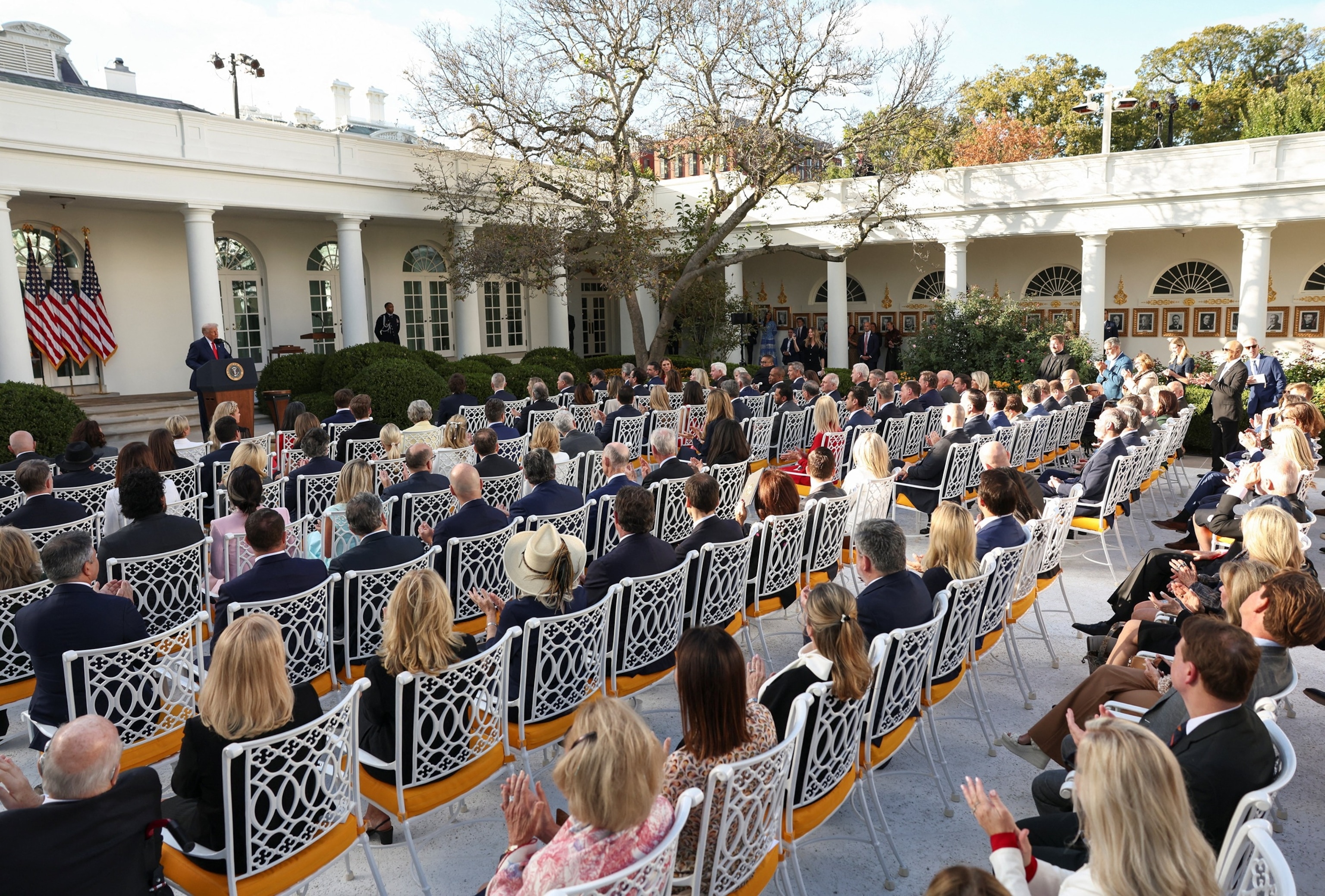 Republican Legislators and various other visitors rest at tables under umbrellas as Head of state Donald Trump talks while organizing a Rose Yard Club lunch, at the White Home in Washington, October 21, 2025.