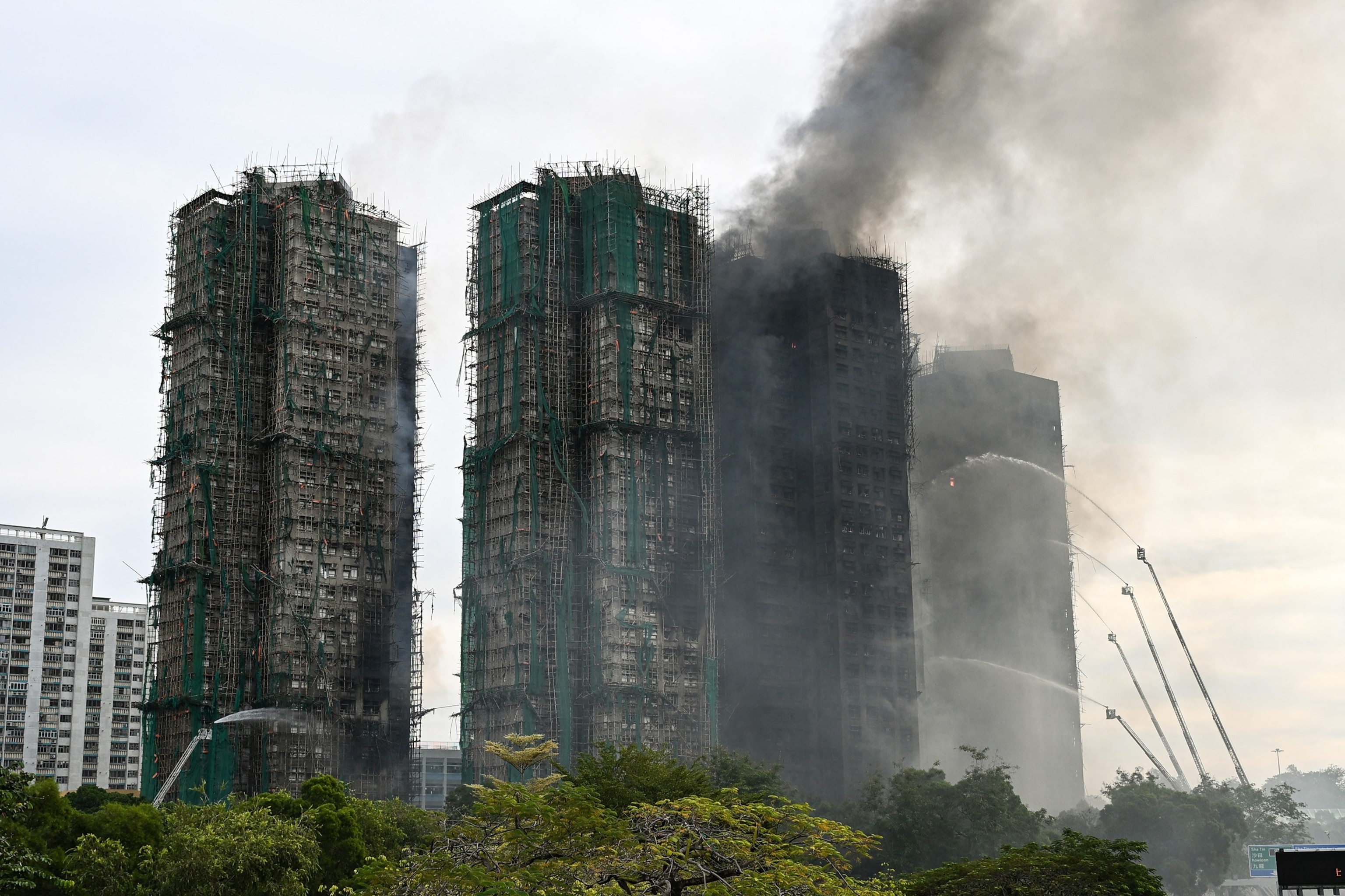 Firemans spray water on fires as a significant fire burns via numerous apartment or condo obstructs at the Wang Fuk Court domestic estate in Hong Kong’s Tai Po area on Nov. 27, 2025.