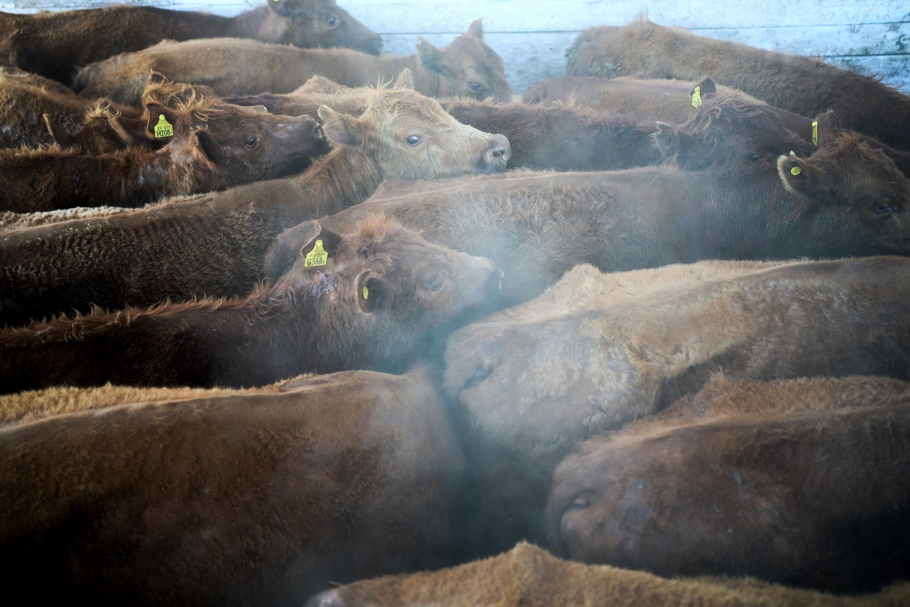 Livestock stand in pens throughout a public auction at the herdsmans’ organization in Brandsen, Argentina, Oct. 20, 2025.