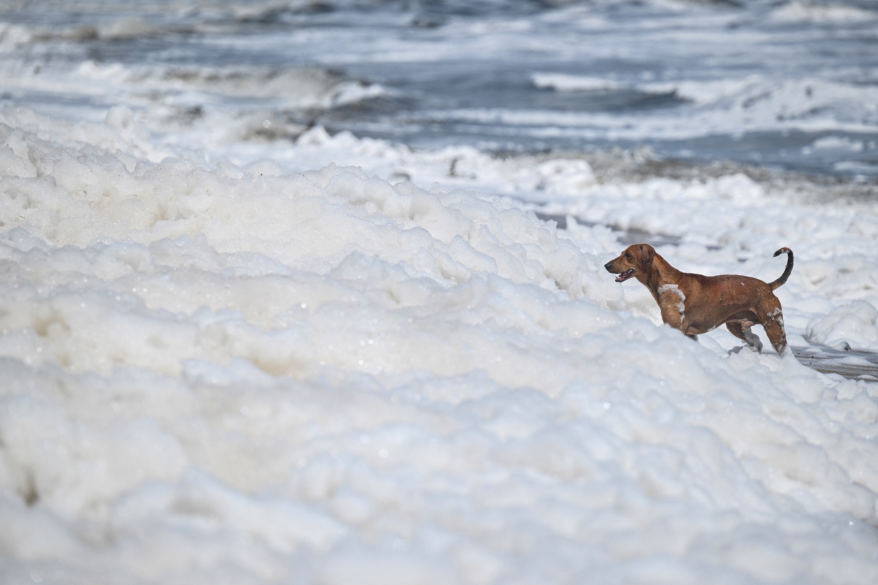 A pet dog stands amidst a harmful thick layer of white foam choking the contaminated Marina coastline in Chennai on Oct. 22, 2025.