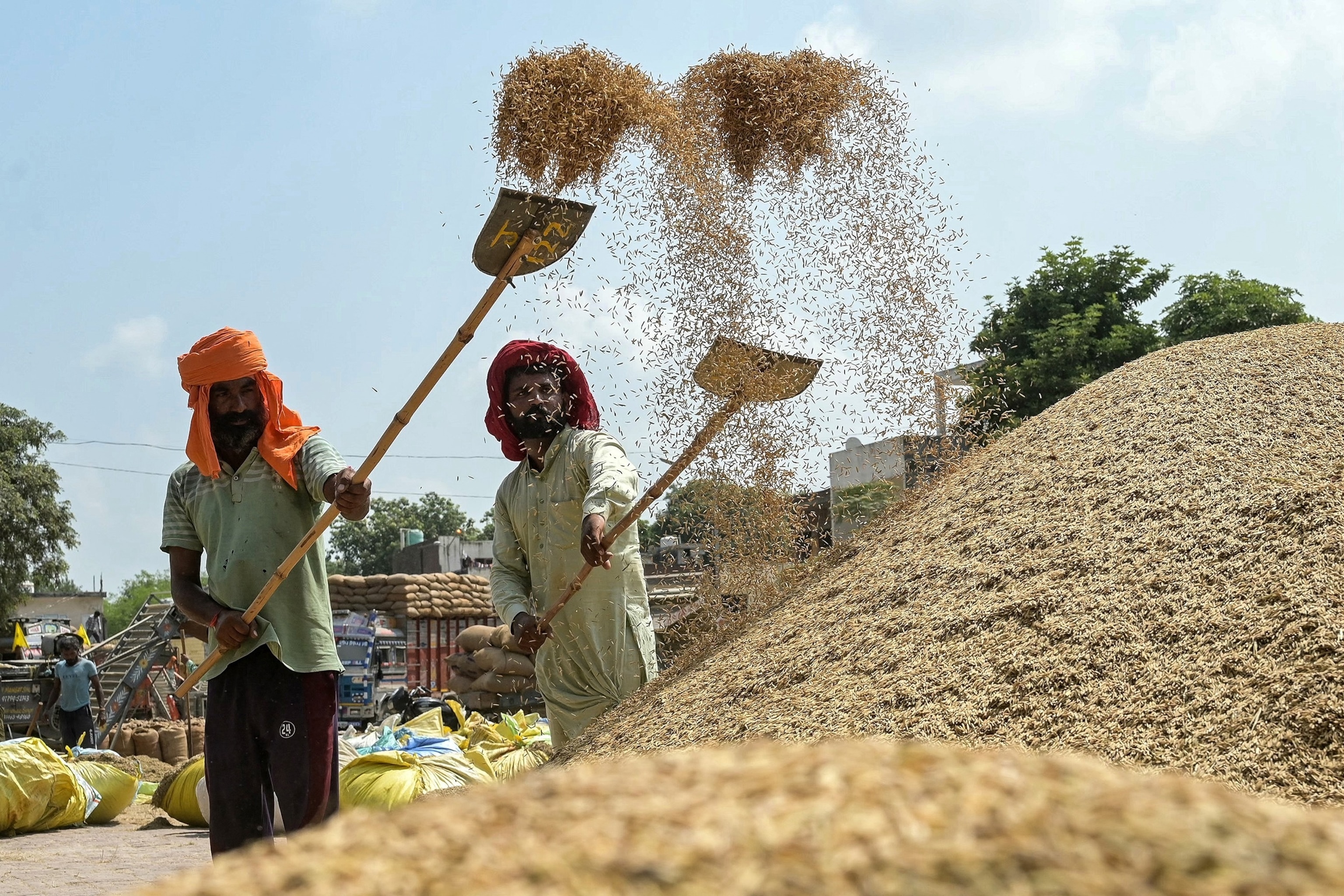 Labourers utilize shovels to different grains of paddy rice from the husk at a wholesale grain market on the borders of Amritsar on September 18, 2025.