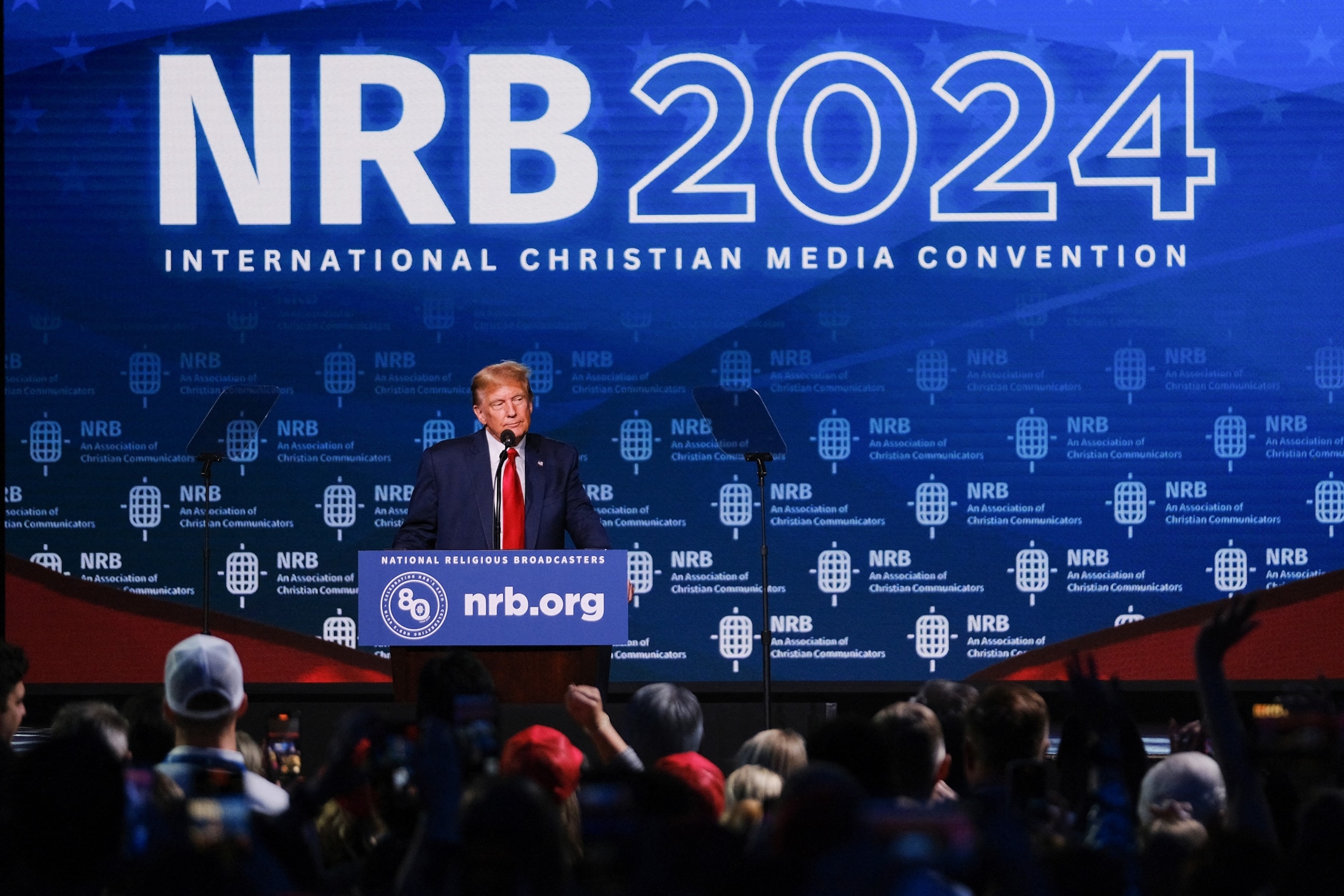 Former Head of state and 2024 governmental enthusiastic Donald Trump addresses Christian broadcasters at the National Religious Broadcasters (NRB) International Christian Media Convention in Nashville, Tenn., Feb. 22, 2024.