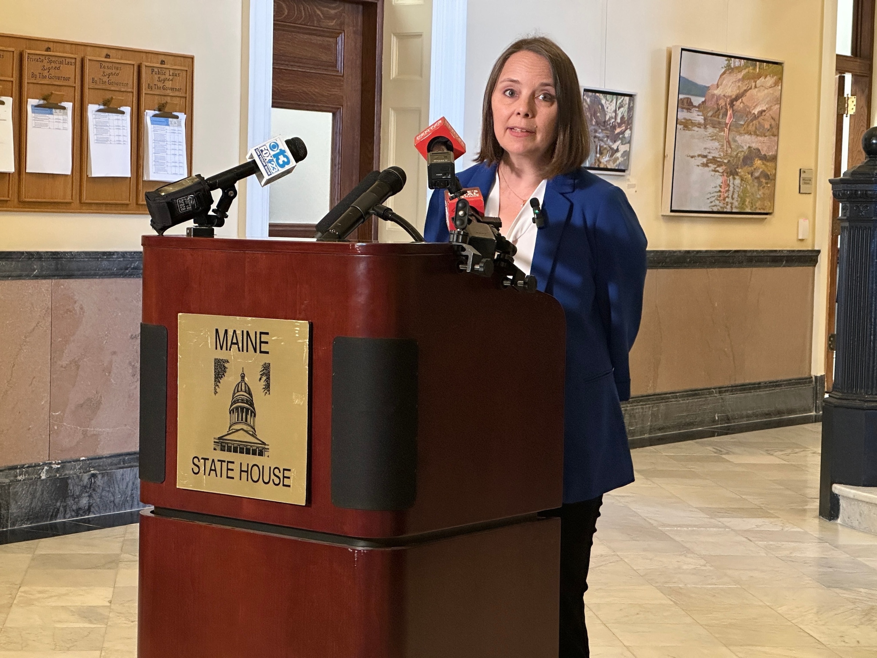 Maine Assistant of State Shenna Bellows talks at a press conference, Oct. 6, 2025 at the Maine State Home in Augusta.