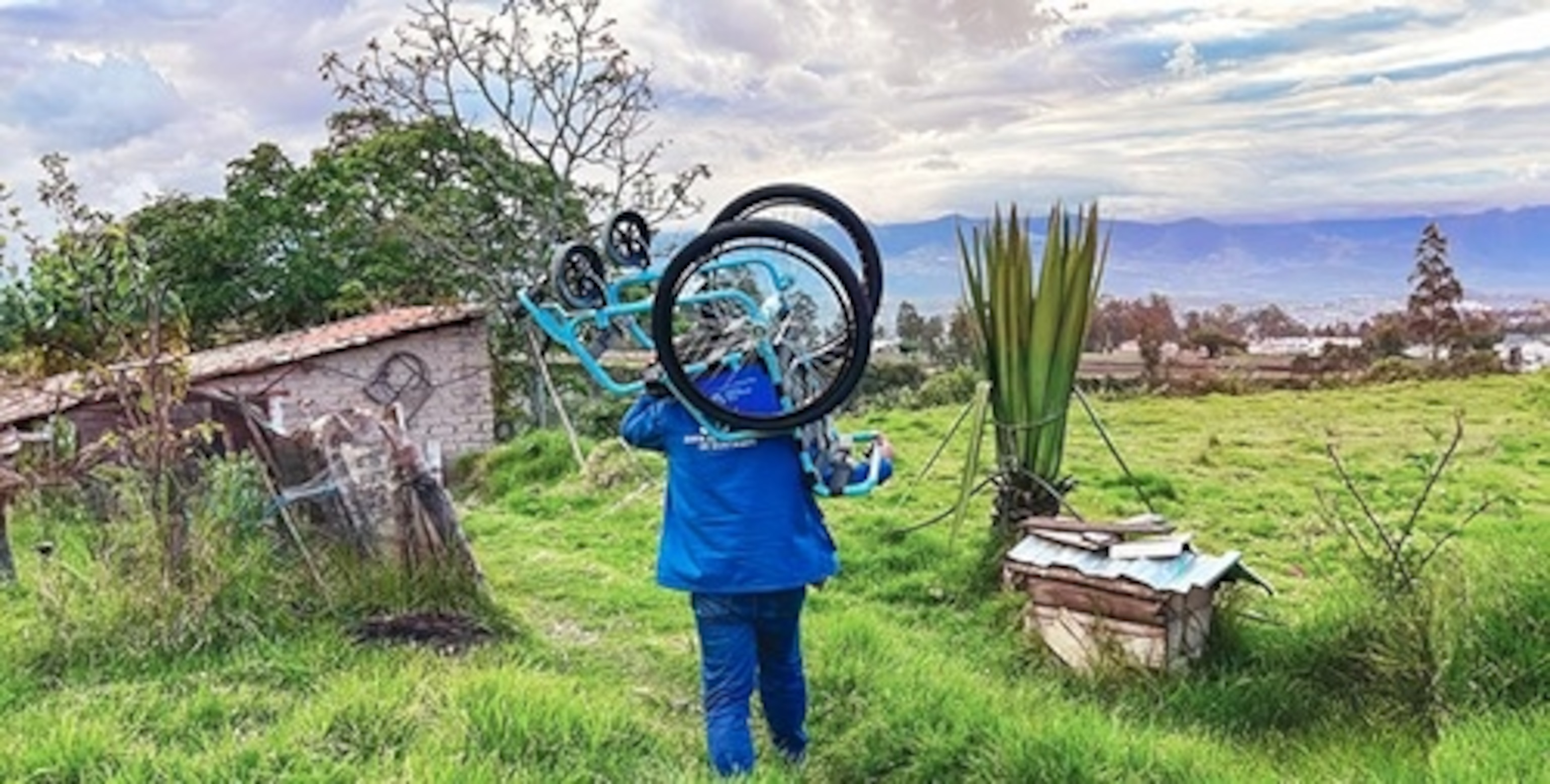 An employee with circulation companion Junta de Beneficencia de Guayaquil supplies a mobility device in Ecuador.