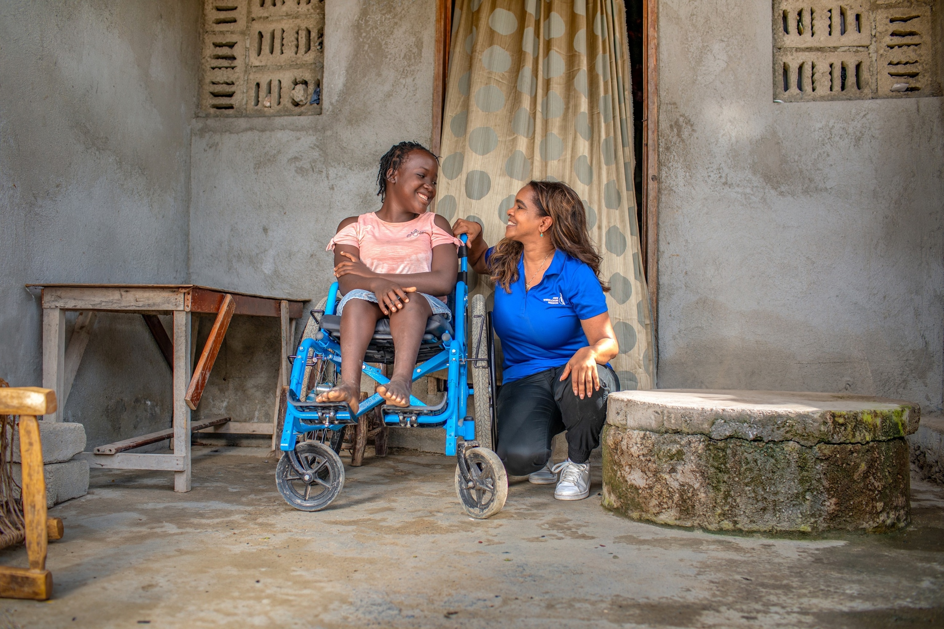 Nuka Hart, Chief Executive Officer of Free Mobility device Goal is revealed with Fabienne Joseph, a mobility device recipient in Haiti.