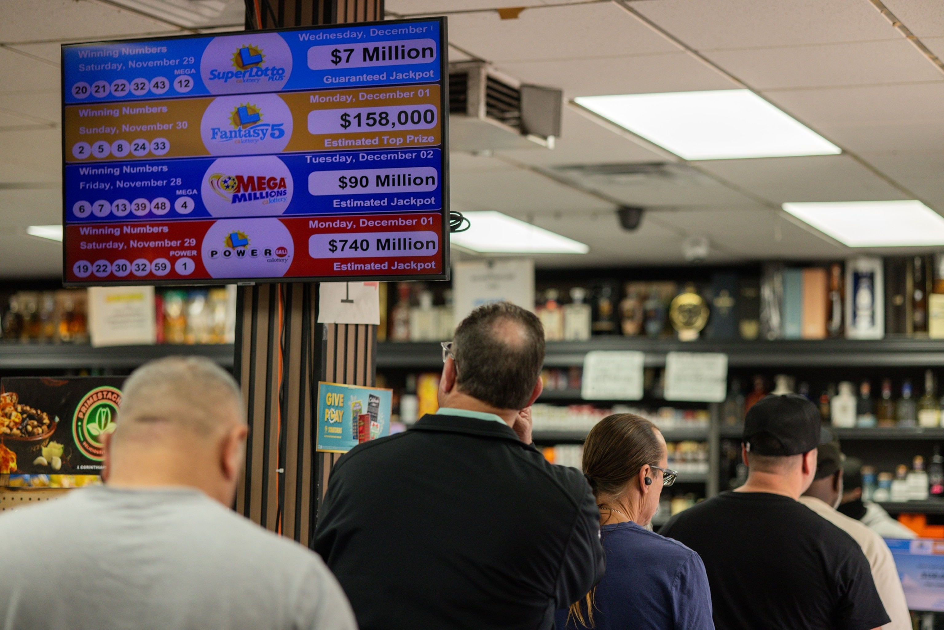 Clients wait in line to acquire lotto tickets on Dec. 1, 2025, in Hawthorne, Calif.