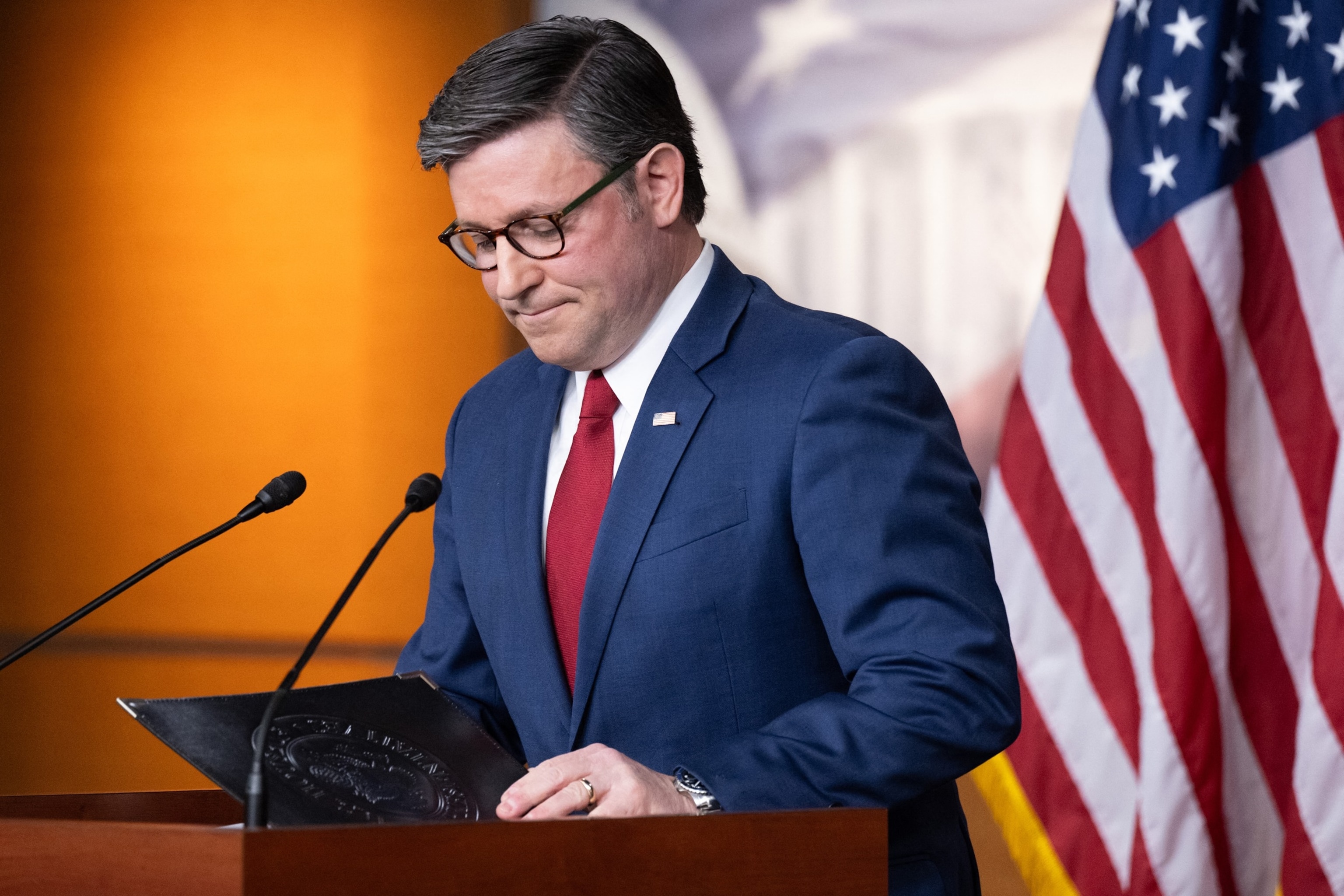 Audio Speaker of your house Mike Johnson talks throughout a press conference at the United States Capitol on November 10, 2025, in Washington, DC.