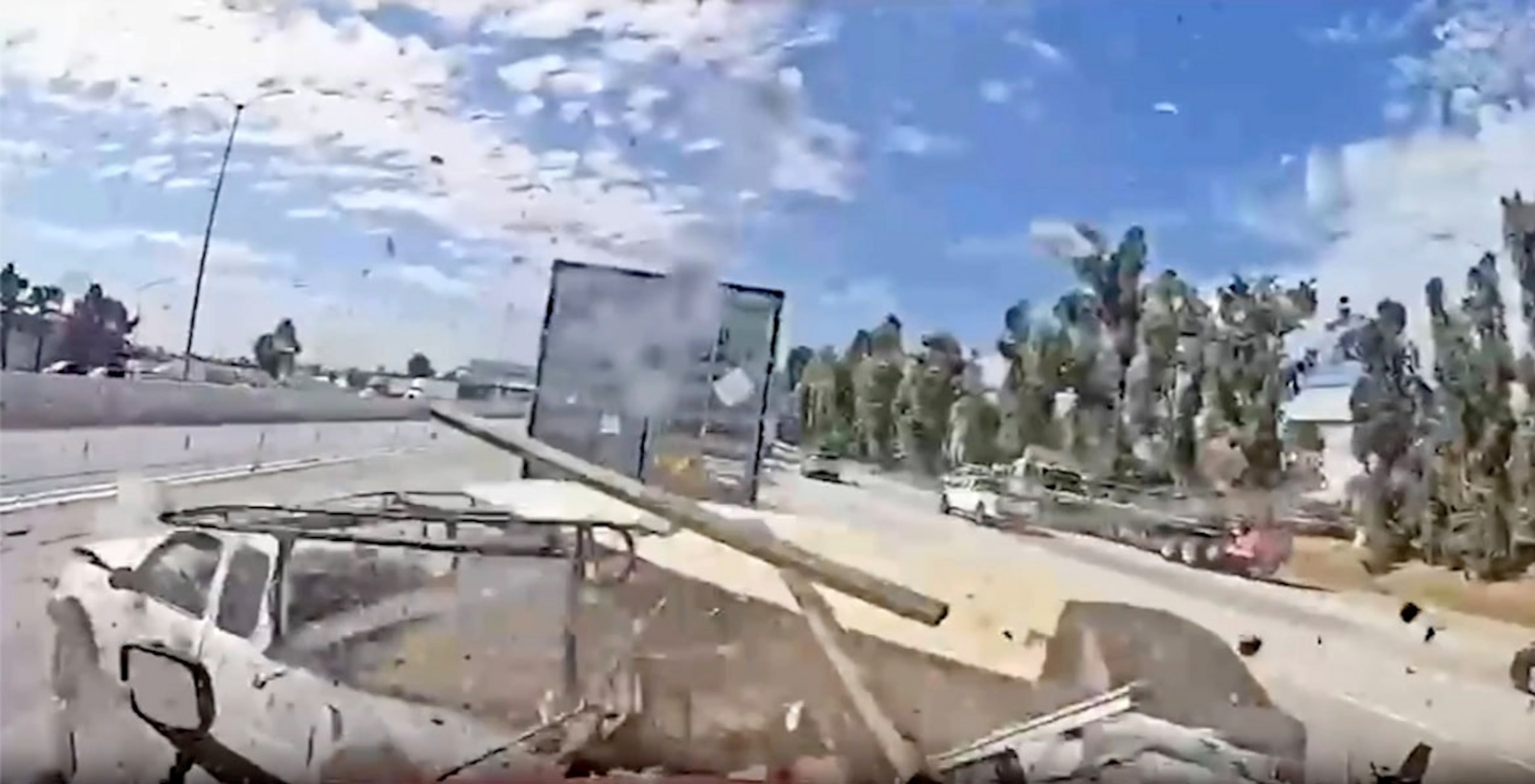 A still from dashboard webcam video of a harmful accident entailing a semi-truck on Interstate 10 in Ontario, The Golden State, Oct. 21, 2025.