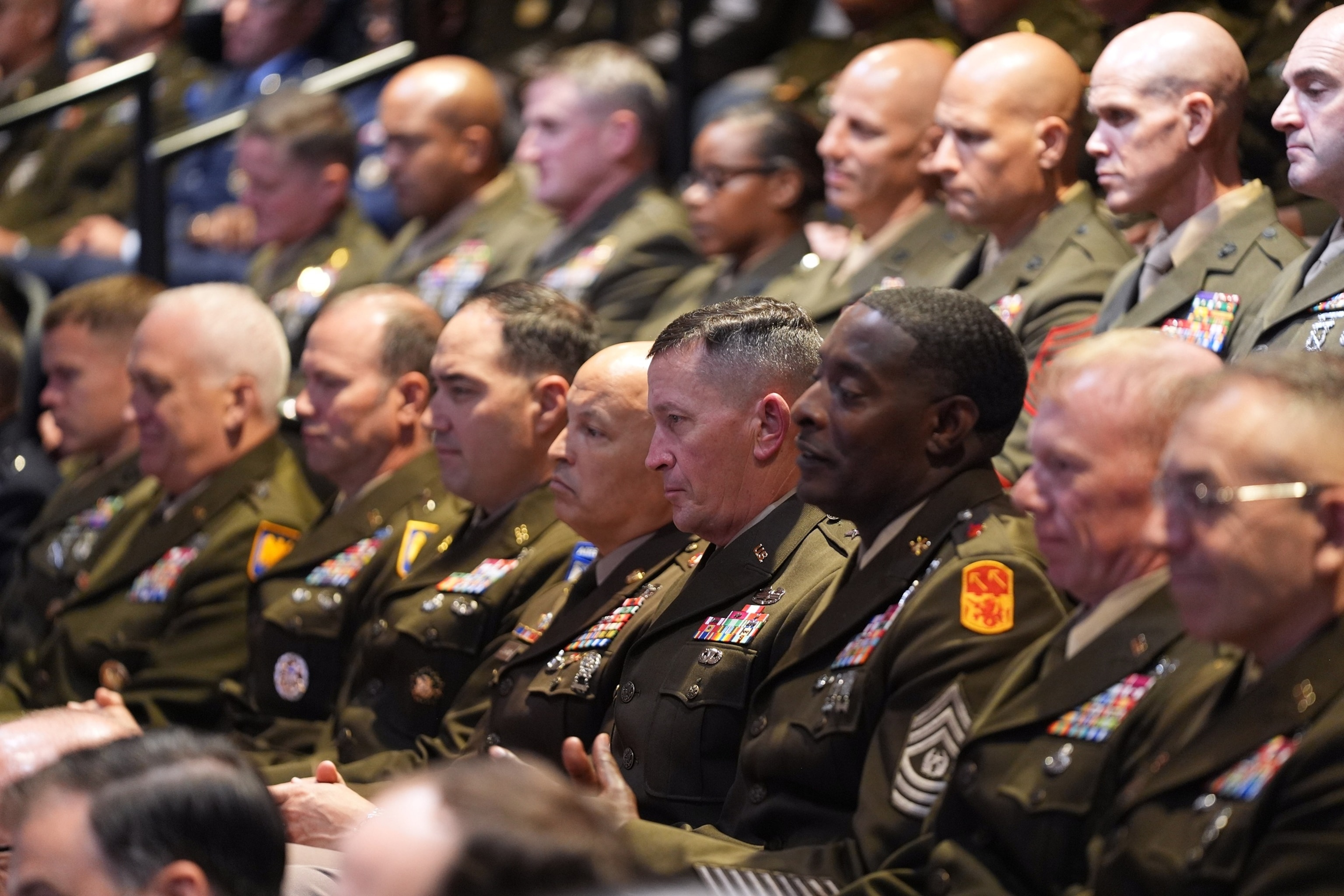 Army participants pay attention as Head of state Donald Trump addresses elderly army policemans collected at Marine Corps Base Quantico in Quantico, Virginia, September 30, 2025.