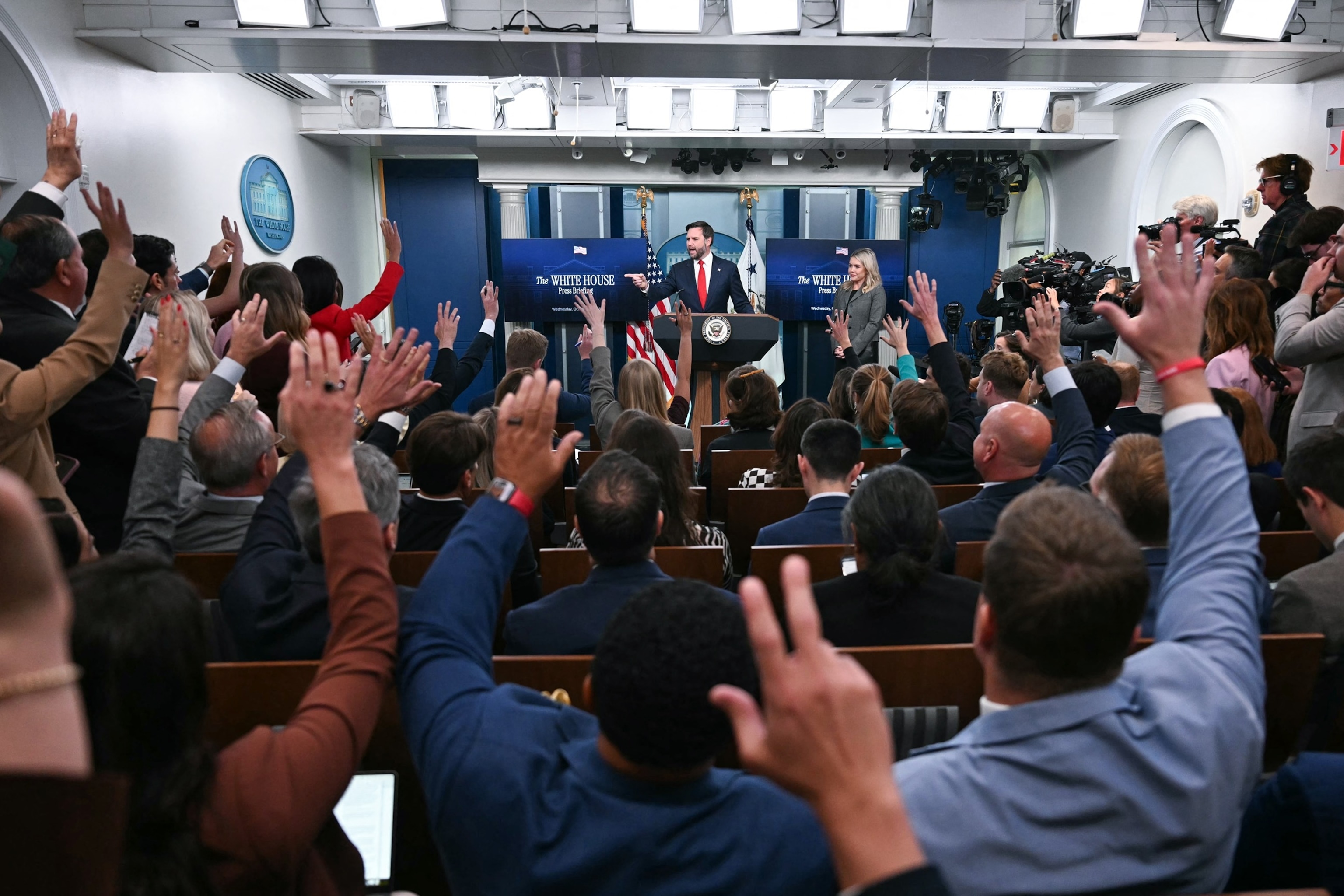 Vice Head of state JD Vance talks together with White Home Press Assistant Karoline Leavitt throughout journalism instruction in the Brady Rundown Area of the White Home in Washington, October 1, 2025.