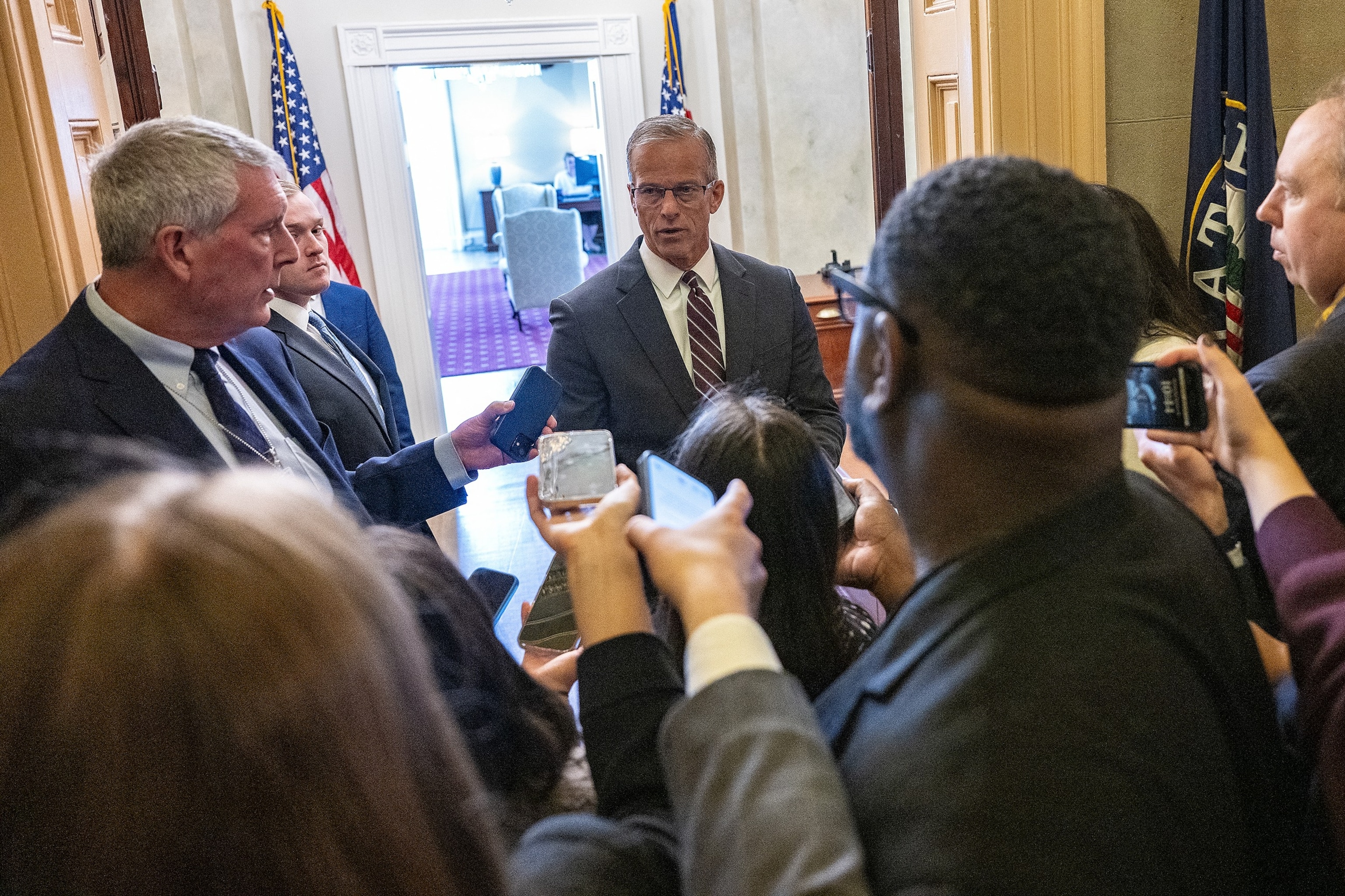 Reporters ask concerns as senate Bulk Leader John Thune, Republican Politician from South Dakota, transforms to enter his workplace at the United States Capitol in Washington, October 29, 2025.