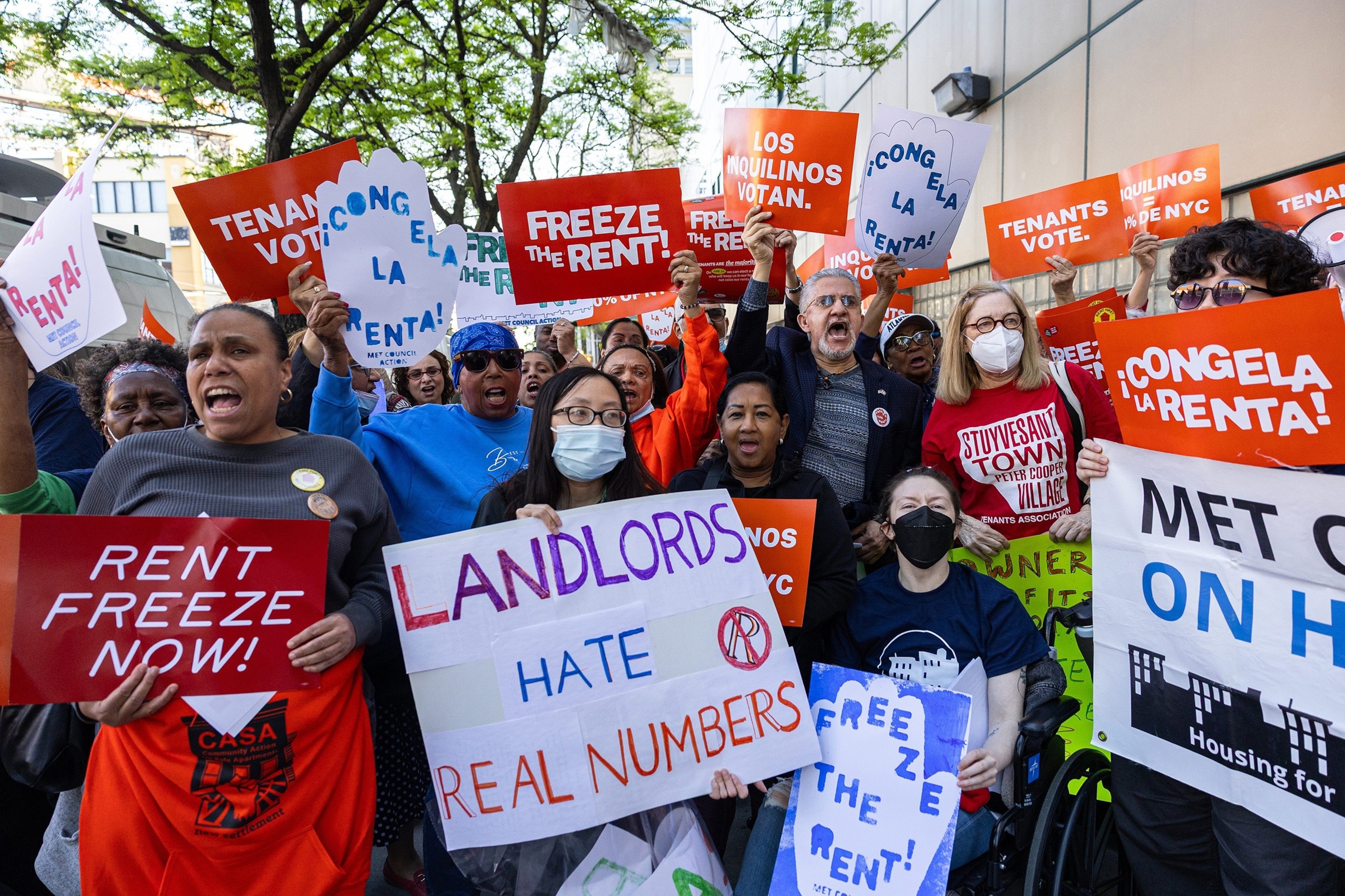 Protesters versus rental fee boosts rally prior to the yearly initial ballot of the Rental fee Standards Board at the LaGuardia Executing Arts Facility in Queens, New York City, April 30, 2025.